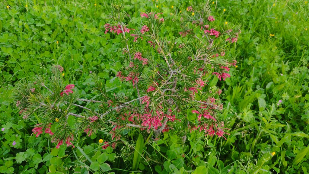 Grevillea rosmarinifolia, her dem yeşil, sık dallı ve çalı formunda bir bitkidir. Onu diğerlerinden ayıran en belirgin özellikleri şunlardır: